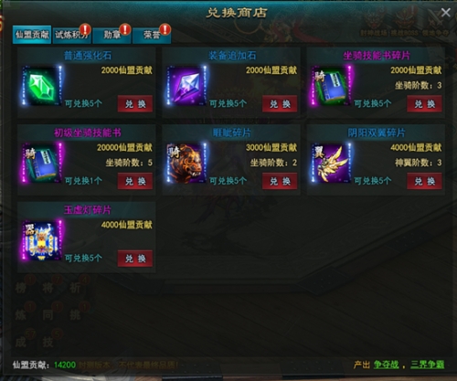 兑换系统是玩家通过仙盟贡献,试炼积分等货币进行兑换道具的功能系统。需要参与日常活动,仙盟活动和竞技场才能获得对应的货币资源。