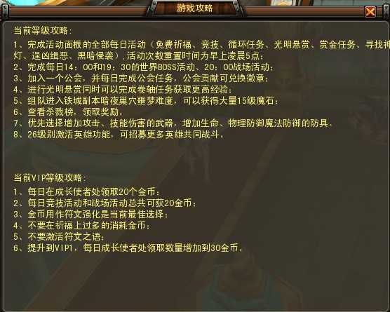 为了避免有些玩家在惊天战神里面玩的不顺心,系统特别整理了一 份游戏攻略,相信细心观察的玩家应该能在初次接触游戏的时候就能发现,系统游戏攻略简洁明了,而且能够根据玩家当前的VIP等级生成相应的VIP等级攻 略,可以说非常用心。在游戏攻略里面的表述,我们可以看到很多关于游戏的玩法,包括每日活动、公会,以及一些游戏中注意的事项,可以令我们快速的成长,极 大的减少了我们在游戏之中消耗的时间和金钱。