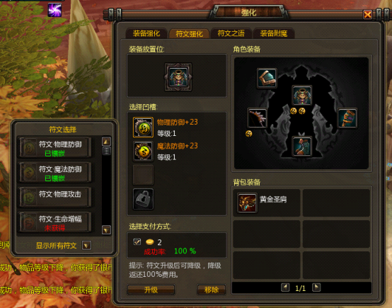 3、符文可以取下,也可以进行降级,取下和降级均返100%返还金币。