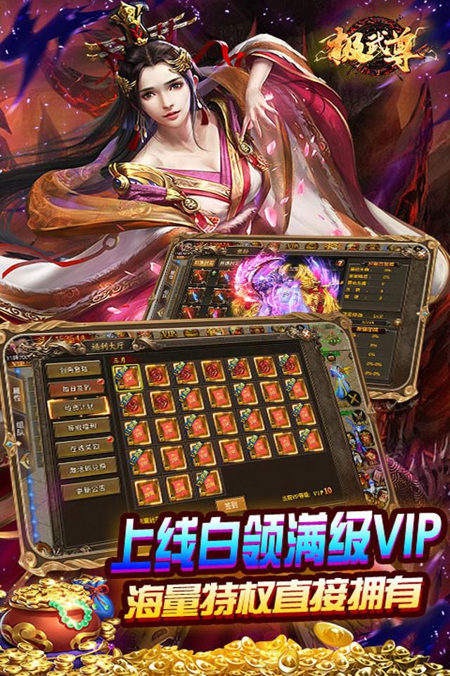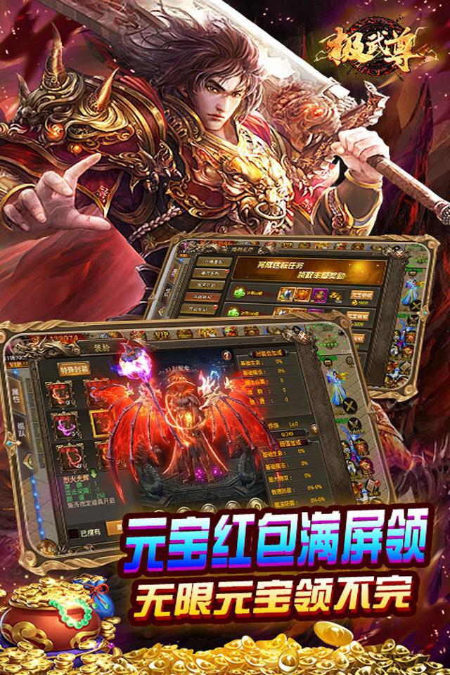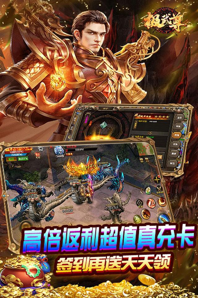 《极武尊(福利满V版)》上线即领取满级VIP,99999元宝,99999绑元,带装备换金系统,真金回收,非常适合散人的传奇玩家长期进行游玩,零氪金玩家也可以通过打怪爆取极品装备,签到还送元宝红包,快来一起下载挑战吧!