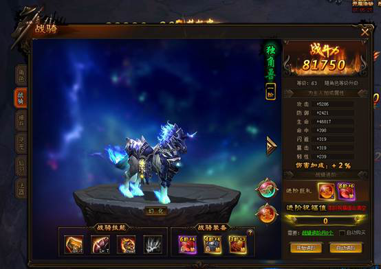 一、完成主线任务开通战骑功能的时候,可以免费获得第一批战骑:“独角兽”,按快捷键“D”就可骑乘。