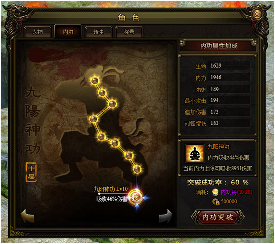 九阳神功每次突破可以给角色提供大量的属性加成,突破每层的最后一星还可以升级九阳神功技能。