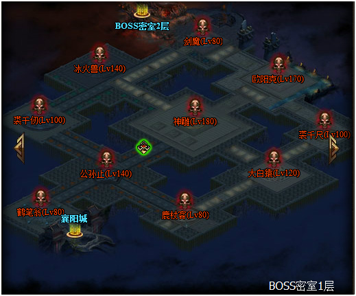 通过襄阳城安全区的BOSS密室传送员可进入BOSS密室地图。
