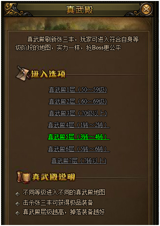 真武殿共分为7层,根据自身的等级、转生等级不同可进入不同的层数。越高层的奖励越丰厚。