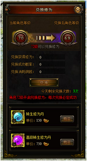 角色转生需要消耗转生修为,转生修为可以通过转生修为丹获得,也可通过消耗经验和铜钱兑换。