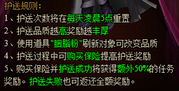不过,高收益的同时也伴随高风险,该时间段也会有很多人打劫,能不能保护好美娇娘就看各位少侠的实力了,担心被劫在给大家介绍个好东西,保险!购买保险,若成功护送多得额外50%收入,若失败,不用急,也可以获得正常奖励哦!