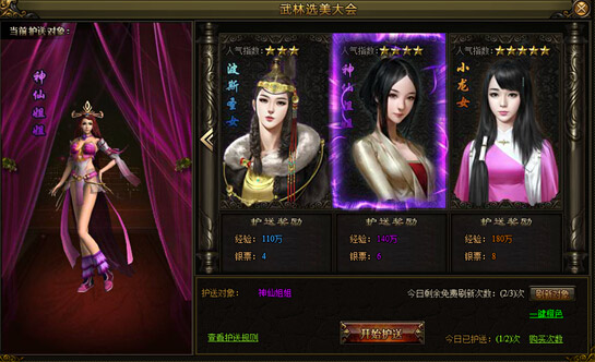 武林选美“中的各色美人包括珠儿、赤练仙子,波斯圣女,神仙姐姐和小龙女。品质送白一直到橙色,相比不用介绍就知道小龙女就是橙色5星,每天有3次免费刷 新机会,可不一定能刷到蓝色以上哦~然而一键橙色仅需20元宝。小龙女的经验可是珠儿的4倍多哦!颜值果然重要,此元宝必花!