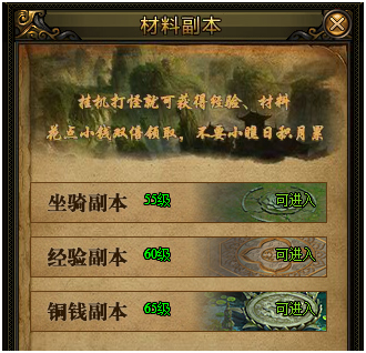 每日副本根据产出不同,分为几种,经验副本可以击杀怪物后可以获得大量奖励,坐骑副本在通关后可以获得大量坐骑进阶丹奖励,铜钱副本在通关后可以获得大量铜钱奖励。