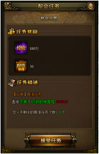 加入帮派后,就可以在襄阳城的安全区内接取帮派任务。帮派任务只需要击杀指定等级以上的怪物即可,在平时挂机时先把帮派任务接上,再去挂机,不仅能获得杀怪的经验,还能从帮派任务上获得海量经验及帮贡。