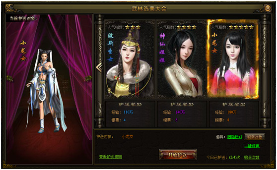 武林选美任务为简单的护送任务,只要将NPC送达到指定地点就可以获得丰厚的任务奖励。 武林选美任务分为白、绿、蓝、紫、橙5个品质,任务品质越高完成时获得的奖励越丰厚,消耗胭脂粉即可刷新任务品质,胭脂粉可以在击杀个人BOSS掉落或在绑定元宝商城购买。
