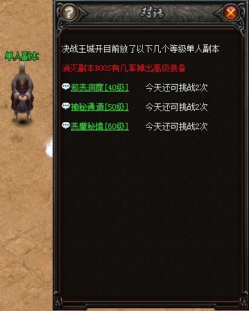 玩家每天均可前往沙漠之城NPC【个人副本】处挑战个人副本,副本BOSS有几率掉落高级装备。