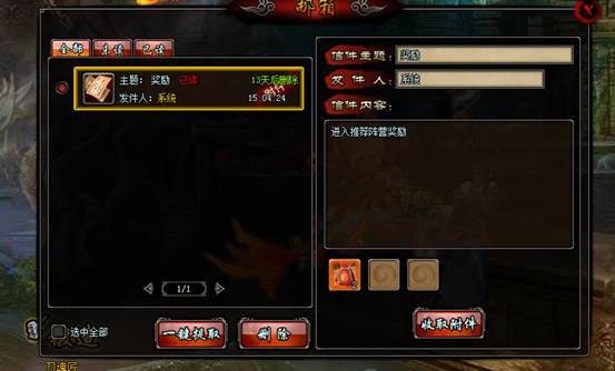 如果邮件过多,您可以选择一键提取邮件里面的获得的奖励,可以依次打开邮件,查看详细信件内容(里面可能不乏重要的内容哦)收取附件。