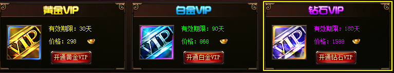 1、每日可领取白金VIP礼包,内含:绑定元宝*30,铜钱*30W,真气*1W,三倍经验丹*1