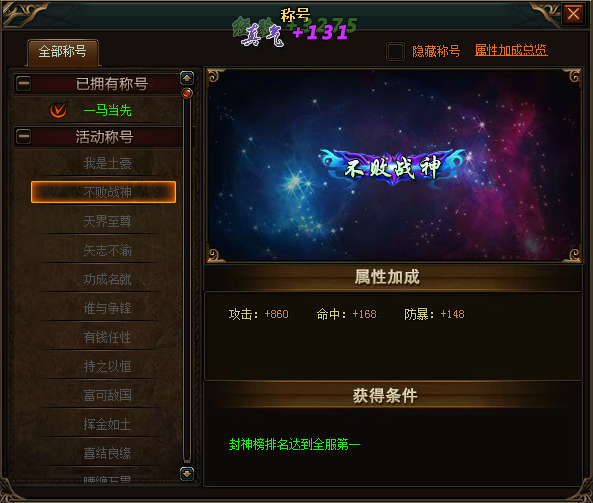 称号里比较容易获得的 就是首冲送的 《一马当先》了,小编其实冲着神将去的,这个称号算是白送的,嗯... 有总比没有好, 毕竟这称号加了攻击, 血量,防御属性。打架的时候也能屌一点。