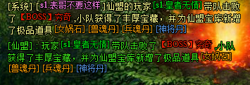 组队击杀野外BOSS之后,组队小队可获得BOSS的掉落哦,同时最后击杀的人可以把给自己仙盟增加极品道具,这些道具都是可以通过仙盟祈福进行抽取