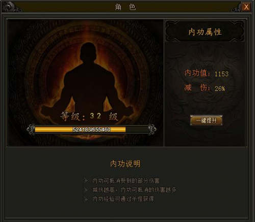 2.内功等级越高,内功值的上限越高,同时能够抵挡更多的伤害