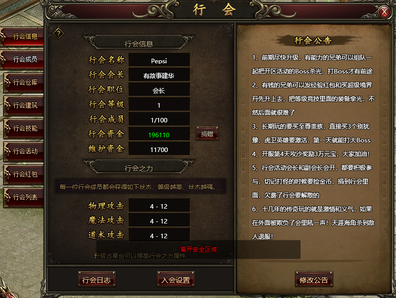 玩家在70级时可以开启行会功能,加入行会后,玩家不仅会有额外属性加成,而且可以通过仓库和其他公会玩家交换装备