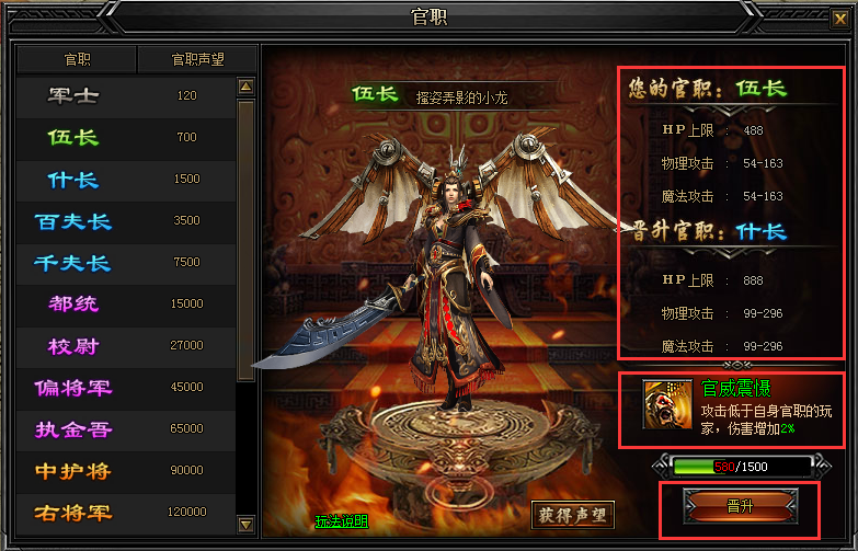 点击晋升即可提升官阶,多多击杀BOSS,不仅掉神器,还给官当。