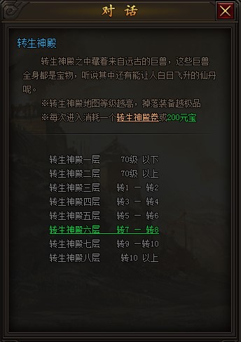 - 只有等级或转生等级达到一定条件才能进入对应的转生神殿地图。