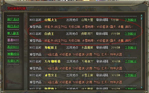 山贼和白虎有几率掉落技能书的。这个2个刷新的时间很短的,5分钟和15分钟,有一起玩的可以叫朋友一起打,不过最好不要是同职业哦。这样出了哪本都有人要的呢。