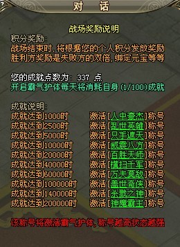 龙城每天晚上的19:00-19:30时间段,龙城“神魔战场”是众多勇相互较量士的地方,神魔里玩家们可以尽情睇相互PK,不需要害怕死后掉装备,杀敌之后还可以获得相应的成就积分,喜欢PK的玩家,这个活动绝对不能错过。