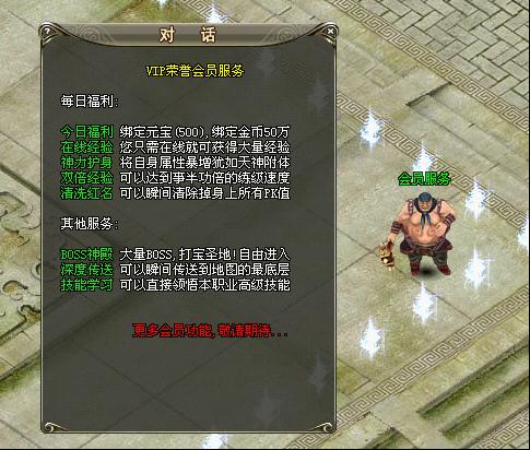 VIP会员每日领取的福利有绑定元宝500,金币50万,一小时双倍升级经验,免费清洗红名一次,神力护身(你懂的),还有在线经验,只要你在线无需 打怪就可以获得大量经验,更可以在会员专属BOSS地图自由进入,大量BOSS随你打。还可以免费学习领悟本职业最高技能和每张地图的深度传送,瞬间传送 到地图的最底层挑战终极BOSS,你知道吗?