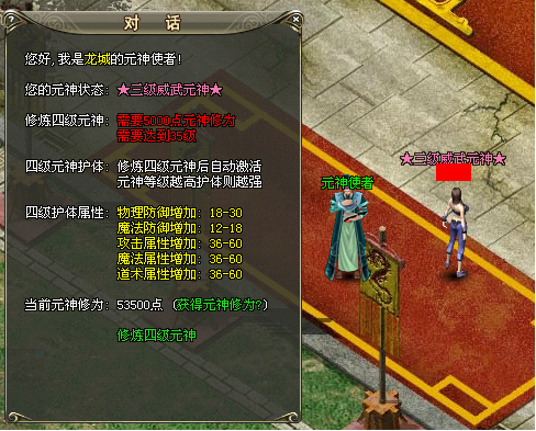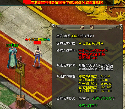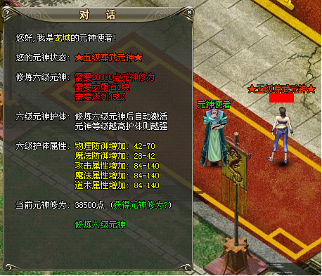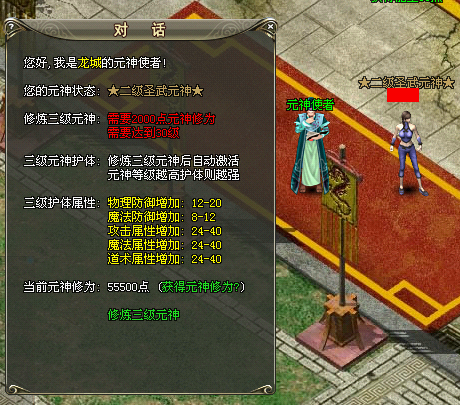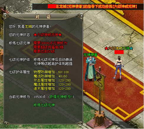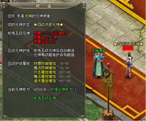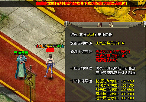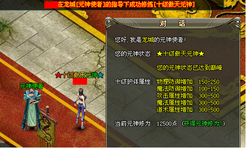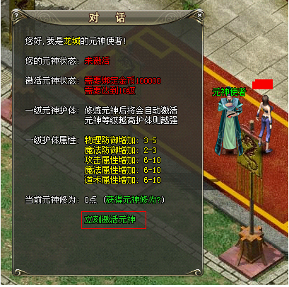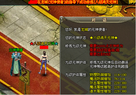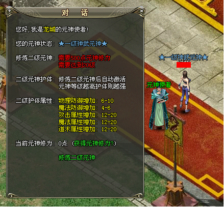 人物达到10级的时候就可以来到王城元神使者处升级自己的元神了。