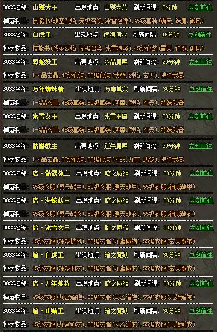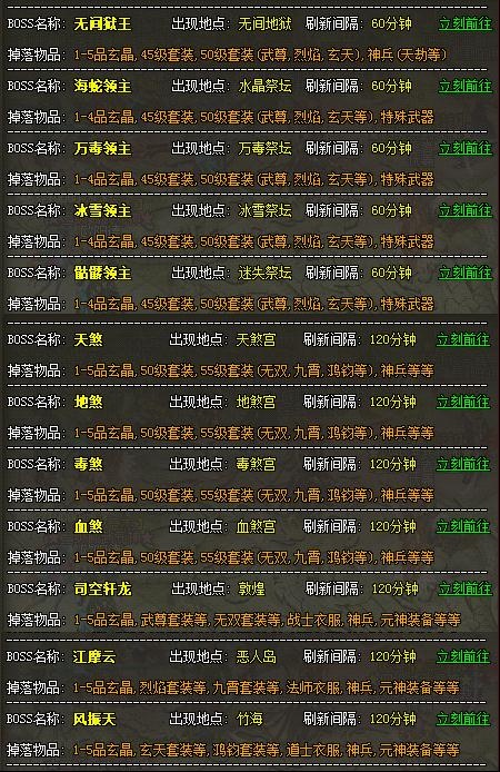 下面就是一些BOSS经常出没的地方和刷新时间,希望能给大家一些参考