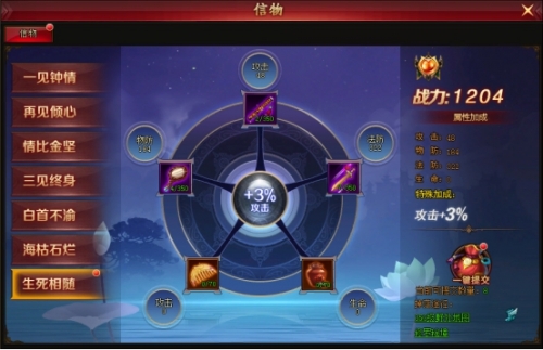 在信物主界面选中页签后可以查看当前页的信物提交数量、属性加成以及信物来源。每层共有5种信物,其中3种为普通信物,2种为稀有信物,提交后可以提升不同属性的加成,若当前层的所有信物均提及满后还将获得特殊属性加成。
