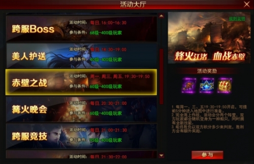 活动将玩家分为吴、魏两个阵营,玩家可通过击沉敌方船只、抢夺BOSS,获得大量积分。在地图的中间海域,海怪BOSS和物资共存。需要玩家发挥自己的才智,利用一些策略,帮助阵营获得胜利。