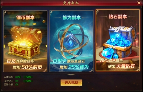 在变身副本中,你可以体验到变身传奇英魂(赵云、吕布、黄忠)去战斗的爽快感,同时你还可以从副本中获得大量铜币、修为甚至钻石这种重要的资源!