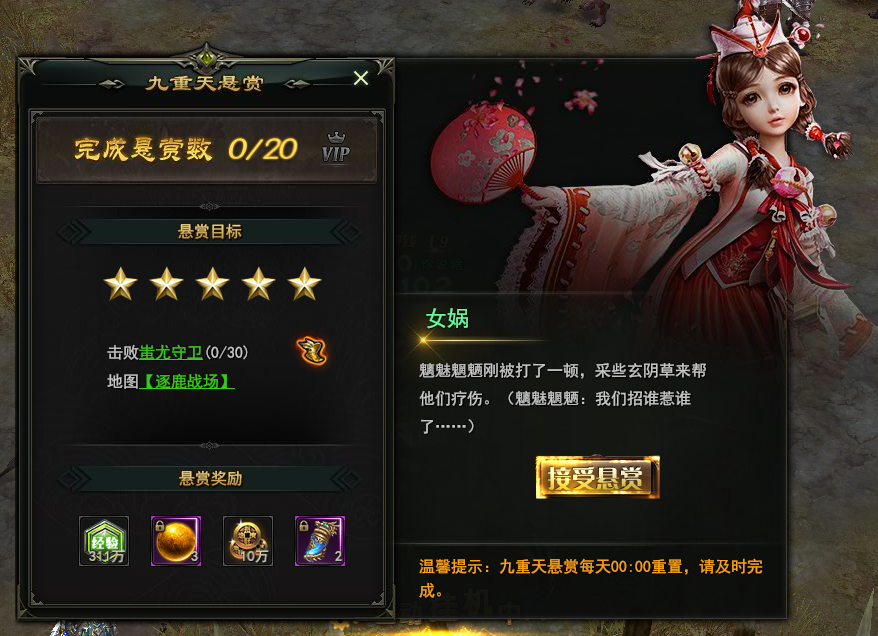 玩家可从任务面板接取九州悬赏任务,每天最多接取20次。
