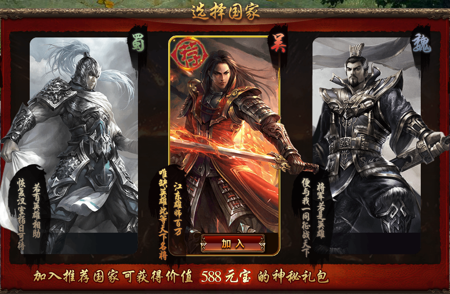 在选择国家时,若是玩家选择了系统所推荐的国家,还可获得价值588元宝的神秘礼包。