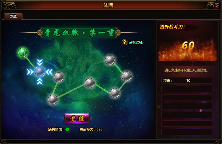 人物升至10级时,系统自动解锁经脉提升功能。经脉系统开启后,玩家可在系统中升级经脉来提升人物属性。升级经脉需要消耗一定修为,修为可通过每日巡查任务和使用修为丹获得。修为丹可在副本和商店中获取。
