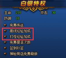 激活白银特权可解锁离线经验加成和打怪经验加成功能,这样玩家就可以在离线时和打怪中获取更多经验。白银特权是永久特权,只需激活一次就可以永久使用。另外激活白银特权还能解锁免费传送功能,可让玩家进行任务更方便。