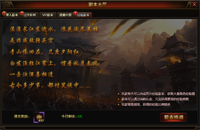 扫荡经验副本可以获得至少百万经验,且人物等级越高,得到的经验越多。玩家每天可扫荡2次经验副本,扫荡过程中使用礼金、元宝可使副本经验翻倍。经验副本在人物等级达到60级且玩家完成相应主线任务后自动开启。