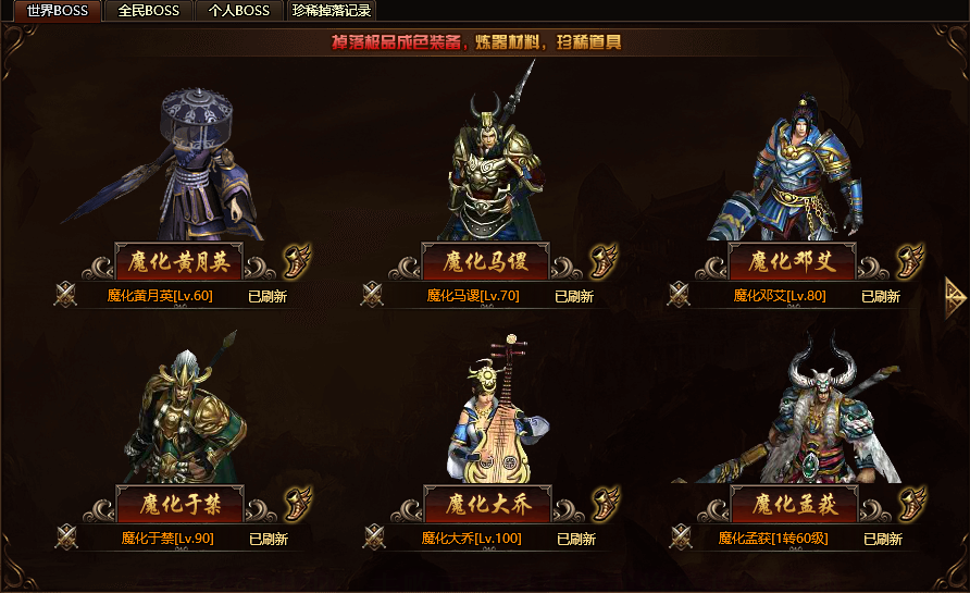 Boss副本是极品装备主要的获取途径。玩家在副本中挑战相应Boss,有机会得到极品装备。Boss副本中有三类boss:个人boss、全民boss和世界boss。玩家挑战世界boss,有较大机会获得完整的极品装备,挑战个人boss有机会获得橙装碎片。玩家等级越高,战斗力越强,在Boss副本中得到极品装备的几率就越高。