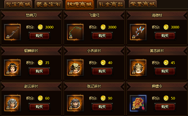 在秘境商店中,玩家可以用宝藏积分来兑换指定的极品装备。目前秘境商店中仅有三件极品装备,分别是飞雷弓、清微杖和怒晴刀。三件极品装备分别对应了三个职业。宝藏积分通过秘境寻宝获得——每次寻宝都可以获得相应的宝藏积分。