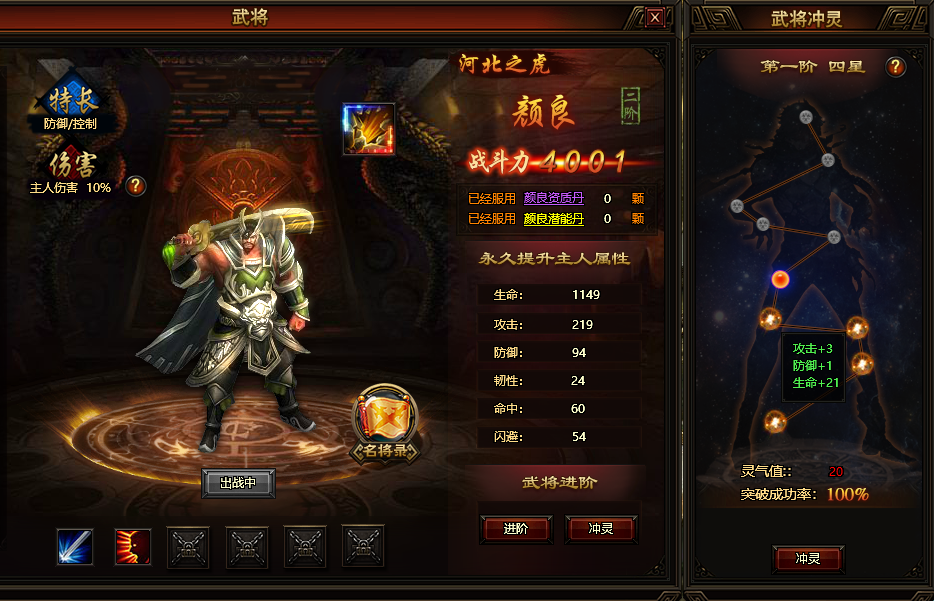 冲灵是武将升级方法之一,可直接提升武将属性。武将每次冲灵都会增加一定的属性值。武将的灵阶越高,冲灵提升的属性就越多。冲灵需要消耗一定灵气,灵气在使用灵气丹后获得。玩家可以在过关斩将关卡中获取灵气丹,过关斩将通关进度越靠前,得到的灵气丹就越多。武将冲灵到10星后,会自动提升灵阶。