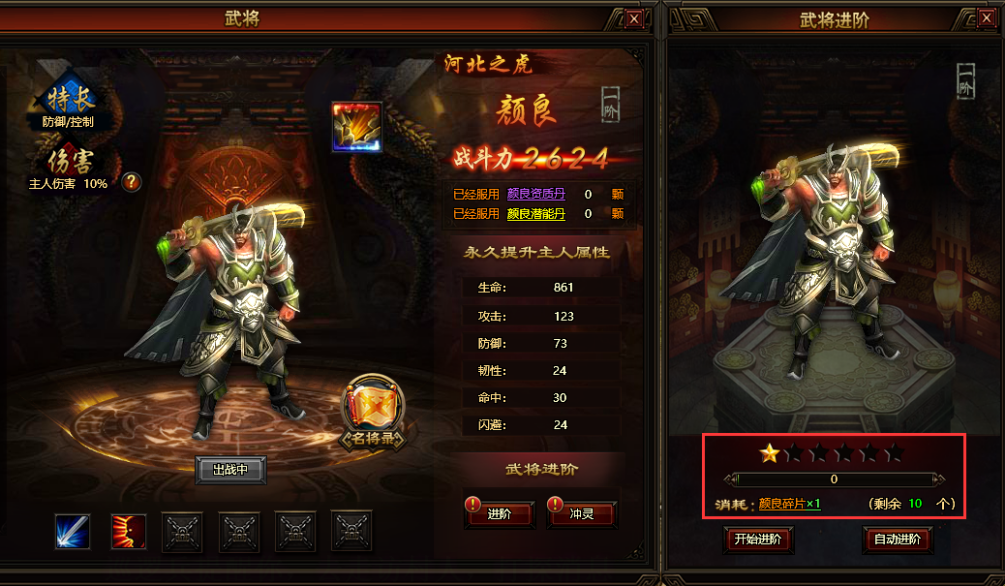进阶分为6个阶段,每完成一个阶段,武将就会增加1颗星星,当星星数量达到6颗后,选择“突破”武将阶数就会自动加1.自动进阶可加快升级速度。武将每次进阶突破后,其武将伤害百分比都会提升1%。武将碎片主要通过扫荡过关斩将副本获得,也可以从活动、商店中获取。