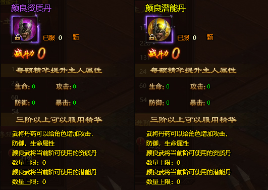 武将升至3阶后,玩家可以给武将服用资质丹和潜能丹来升级武将。资质丹和潜能丹可增加武将的攻击力,同时能提升玩家的属性。资质丹和潜能丹可通过限时活动、副本、荣誉商城和神秘商店等途径获取。