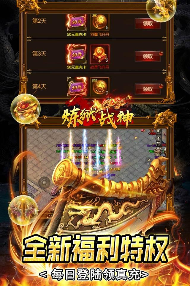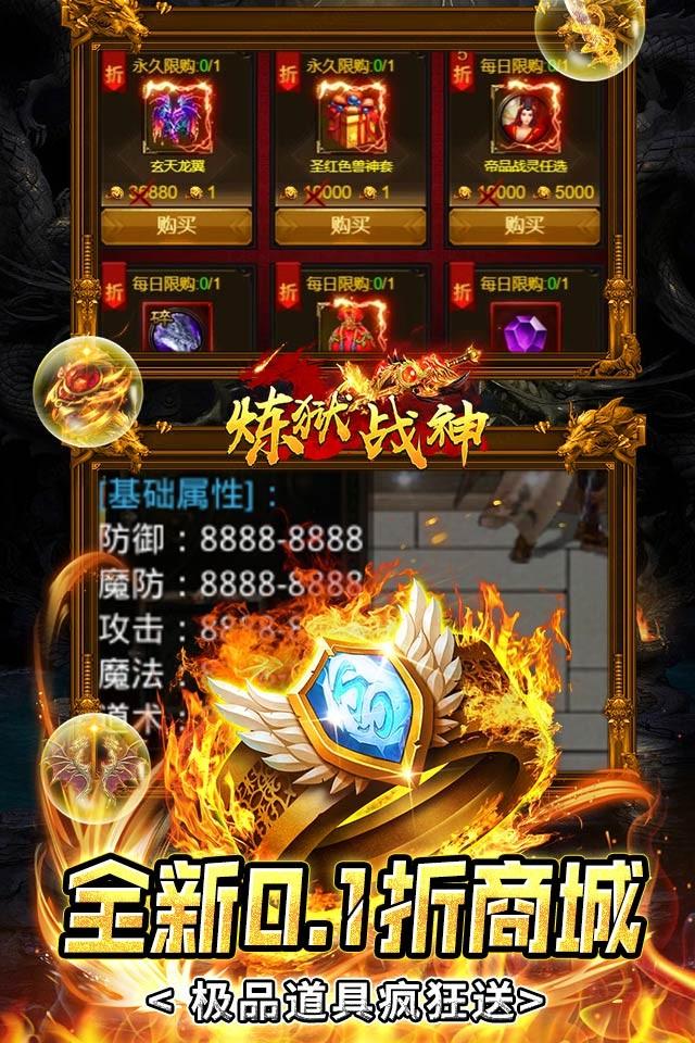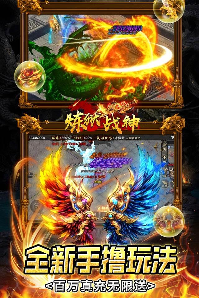 《炼狱战神》是一款独创四职业经典挂机!上线送vip15,元宝*1000000,金币*10000万、绝版时装套,豪华资源轻松开局!全新版本解锁新姿势,GM手撸无门槛真点充,手速越快金额越高;内置0.1折大商城,所有道具百倍返利,最低0.1折购买!输入BUG指令,每日获得大量真充和升阶资源,GM打宝地图更有神秘宝藏等你来爆!快来邀请你的好游一起来解锁船新的买断版本吧!