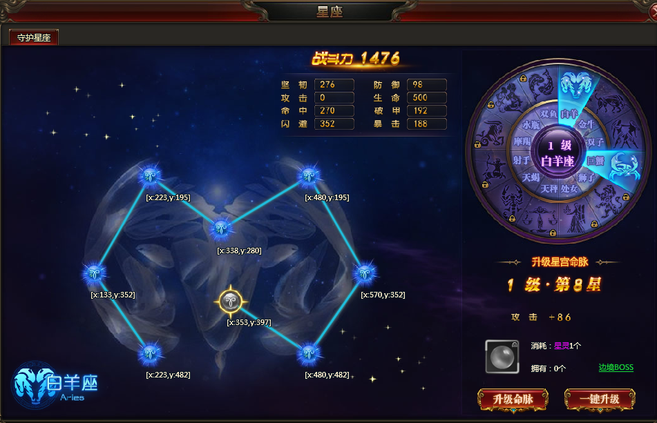 星宫命脉有12个守护星座,每个星座所提升的属性类型都不一样。