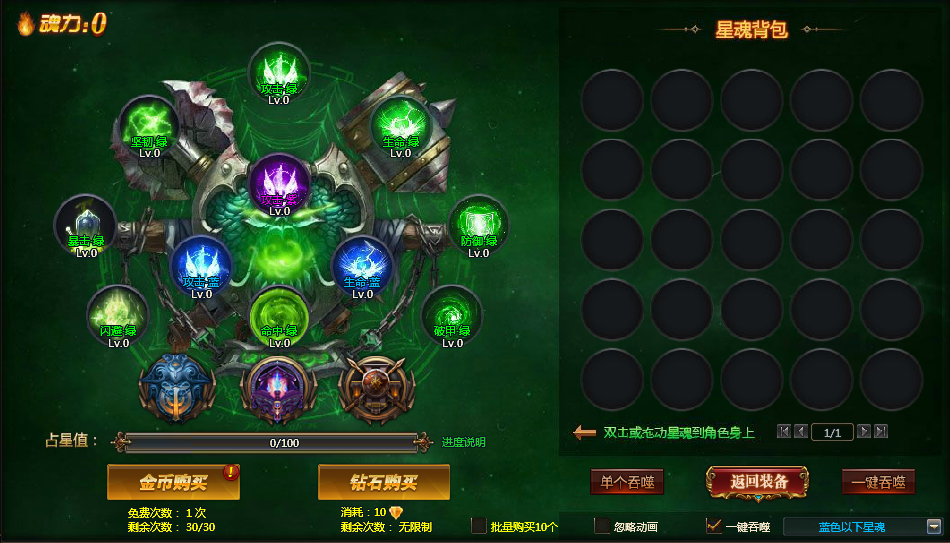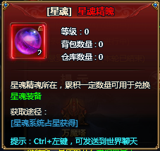 1. 消耗一定绑定金币,即可购买星魂石,获得占星机会,随机获取各种不同属性的星魂;