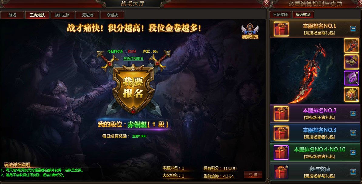 4. 玩家通过竞技场获取的金券可以通过竞技兑换商店兑换坐骑、神兵、翅膀等技能书。