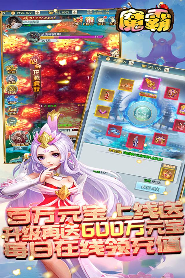 魔霸(GM无限送充值)是一款仙侠类风格的大型多人在线角色扮演类游戏。上线就送百万元宝、VIP13、888W金币。此外,游戏内还赠送了大量充值卡,可以激活GM商城,GM商城所有道具均一元宝购买。挑战boss最高可爆998元真充卡。