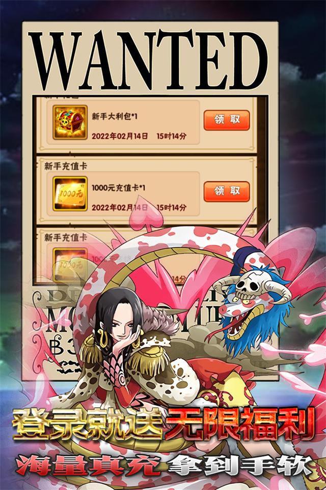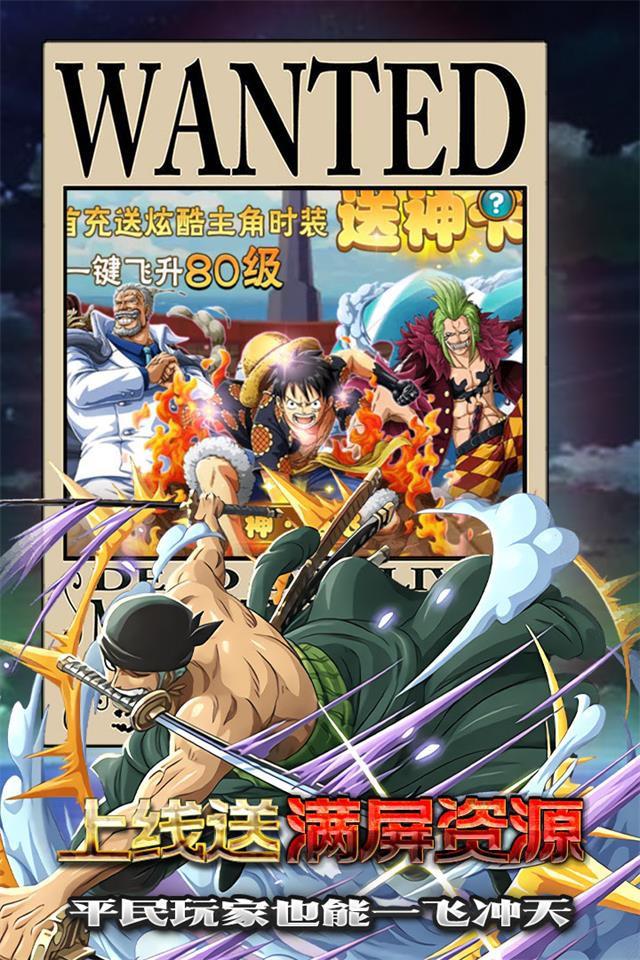 本款游戏以海贼王为游戏背景,玩家出生在海盗肆行的海域上,为了争夺宝藏,与各路海盗展开激战,组建属于自己的小队,带着伙伴砥砺前行,游戏玩法新奇,上线送至尊GM、千万钻石、千万贝利,登录就送千元真充卡与新手代币礼包,疯狂商城福利多,激活每日可无限领取资源、GM神权福利一经激活,每日领取超值豪礼,更免费神权相送。还等什么,快来开启海上之旅,创建属于自己的海贼小队。