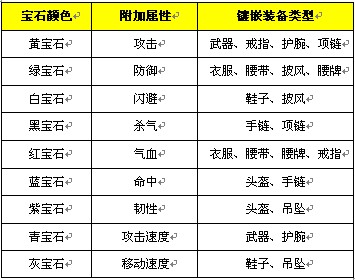 宝石分为红、绿、白、蓝、黄、蓝、黑、紫、青、灰几种,增加对应附加属性: