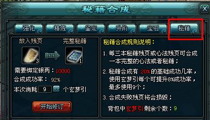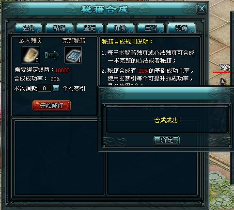 2. 秘籍合成有20%的基础成功机率,可以使用“玄梦引”来提升成功率,每个玄梦引可提升8%的成功率,一次最多使用9个。