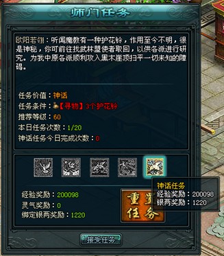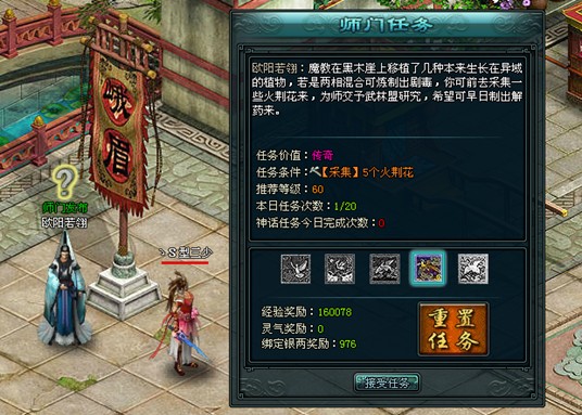 《梦江湖》中,当你等级达到20级,便可以在洛阳城中心,自己门派掌门处领取到师门任务。